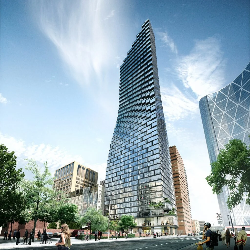 Telus Sky is connected to the +15 network, is on the east/west C-train routes, is on over 10 bus routes with underground parking as well as a bicycle parkade. If you’re on a bicycle, take the entrance to the right of the Telus Sky parkade and follow the bicycle ramp.